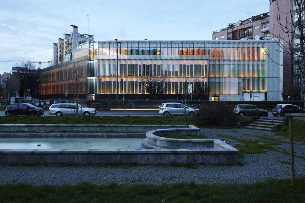 Un esempio del rinnovamento del linguaggio figurativo tramite lo studio dei materiali e le nuove tecnologie e dell’importanza del dettaglio come valore progettuale che conduce dal particolare al generale é il progetto per il nuovo centro servizi Rolex Italia a Milano. La trasparenza schematica ideata per la facciata crea differenti relazioni tra spazi interni ed elementi esterni. Lo studio ha elaborato una struttura innovativa di colonne portanti interposte tra facciate in vetro e una tecnologia doppia pelle di frangisole: un doppio vetro stratificato alternato a una lastra di acciaio perforato di un millimetro di spessore, rimando progettuale all’acciaio utilizzato per la indicazione degli orologi del marchio. Esempio di quell’artigianato ‘romanolizzato’ che si esprime nelle minuziosa precisione con cui sono progettati i frangisole e gli schermi verticali di questo edificio, motorizzati in modo da combinare automaticamente angolazione con lo spostarsi del sole. Nulla è lasciato al caso.