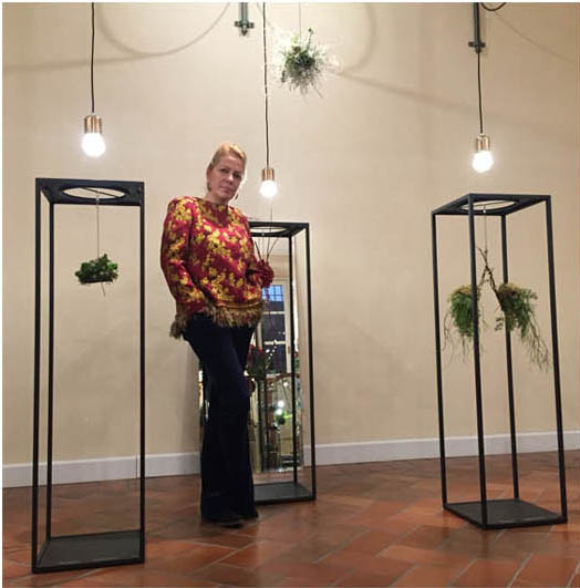 Nella mostra a lei dedicata durante lo scorso inverno al Baka Blanca Concept Gallery ad Arona nel Palazzo Borromeo, l’ installazione che ha realizzato accompagnava l’occhio del visitatore nella visione che le appartiene…:”cuore”, “cervello”, “polmoni”, realizzati con piante, arbusti, bacche, muschio e fiori, che rappresentavano le funzioni vitali simbolicamente degli organi umani, contenuti e sospesi in una struttura di ferro che ne esaltava la  dimensione reale e tridimensionale, in un concetto di struttura architettonica.