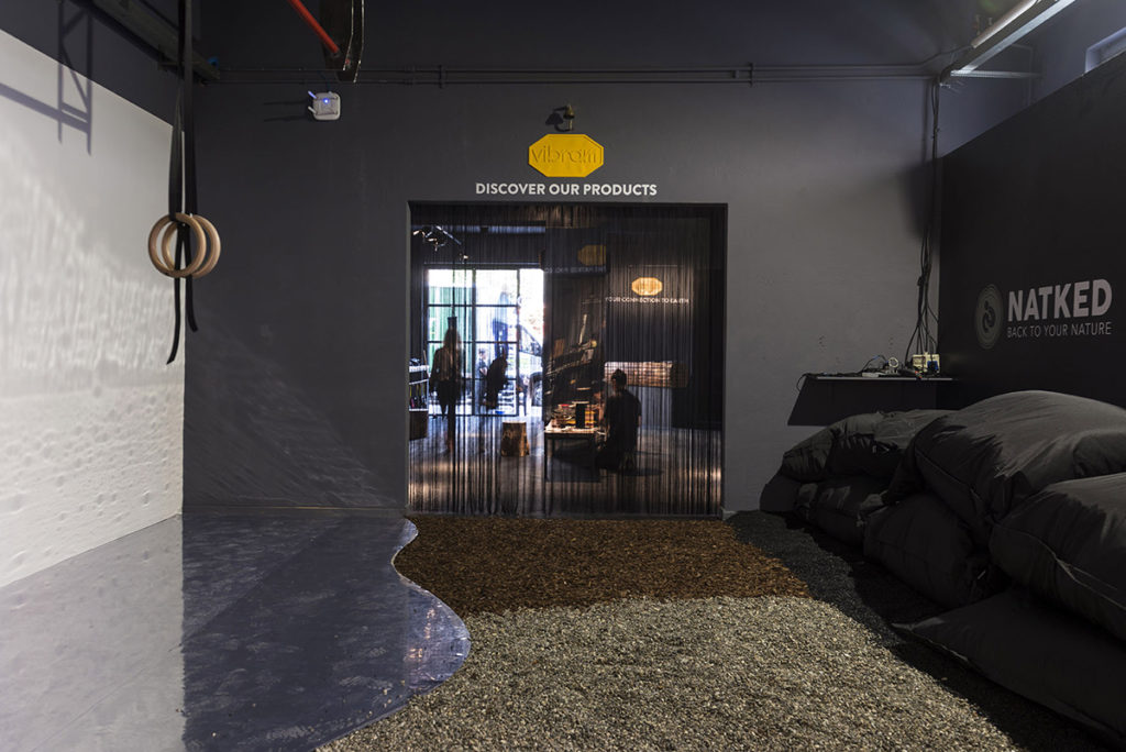 Dal Vibram Tech Center hanno iniziato a svilupparsi altre situazioni come lo showroom di via Sanzio e il Connection Lab a cui stiamo lavorando ora, un incubatore di idee legate al marchio Vibram a cui si collegano altre società. Per il Salone del Mobile 2018 Marco Bramani ha voluto presentare il pop up store. per una settimana si sono svolte attività di diverso tipo legate al corpo umano, in contatto con il terreno e la natura. Dalla prova della scarpa su terreni diversi come pietra e legno, all’esperienza in cui il piede e la scarpa venivano specchiati su superfici riflettenti, al laboratorio in cui si poteva modificare la suola delle proprie scarpe o lo zaino grazie all’intensa collaborazione con Ferrino.