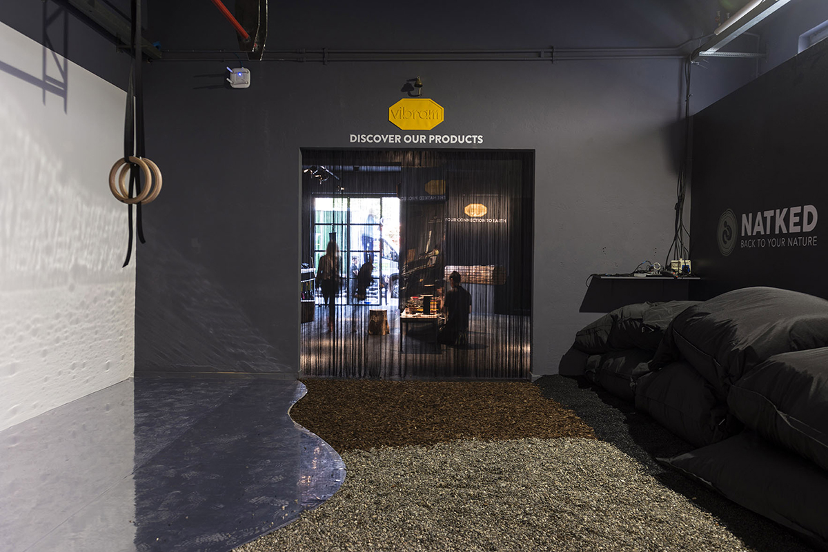 Dal Vibram Tech Center hanno iniziato a svilupparsi altre situazioni come lo showroom di via Sanzio e il Connection Lab a cui stiamo lavorando ora, un incubatore di idee legate al marchio Vibram a cui si collegano altre società. Per il Salone del Mobile 2018 Marco Bramani ha voluto presentare il pop up store. per una settimana si sono svolte attività di diverso tipo legate al corpo umano, in contatto con il terreno e la natura. Dalla prova della scarpa su terreni diversi come pietra e legno, all’esperienza in cui il piede e la scarpa venivano specchiati su superfici riflettenti, al laboratorio in cui si poteva modificare la suola delle proprie scarpe o lo zaino grazie all’intensa collaborazione con Ferrino.